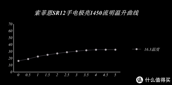 下图是使用高温快速电子测温仪对这款SR12进入极亮1450流明降档散热性能做简单测试。测试时的室内环境温度为16.3摄氏度,静态,无风。测试时间5分钟.由于测试受室温和测试环境位置以及测试者水平的影响,数据可能存在误差情况,以下图表数据仅供参考。